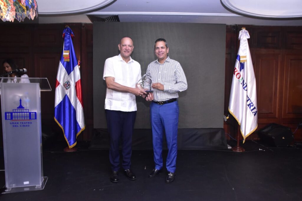 Al finalizar su ponencia, el director general de ProIndustria, Ulises Rodríguez, y la directora de Servicios de Apoyo a la Industria de esta institución, Ilonka Acosta, entregaron un reconocimiento especial a Omar Méndez.